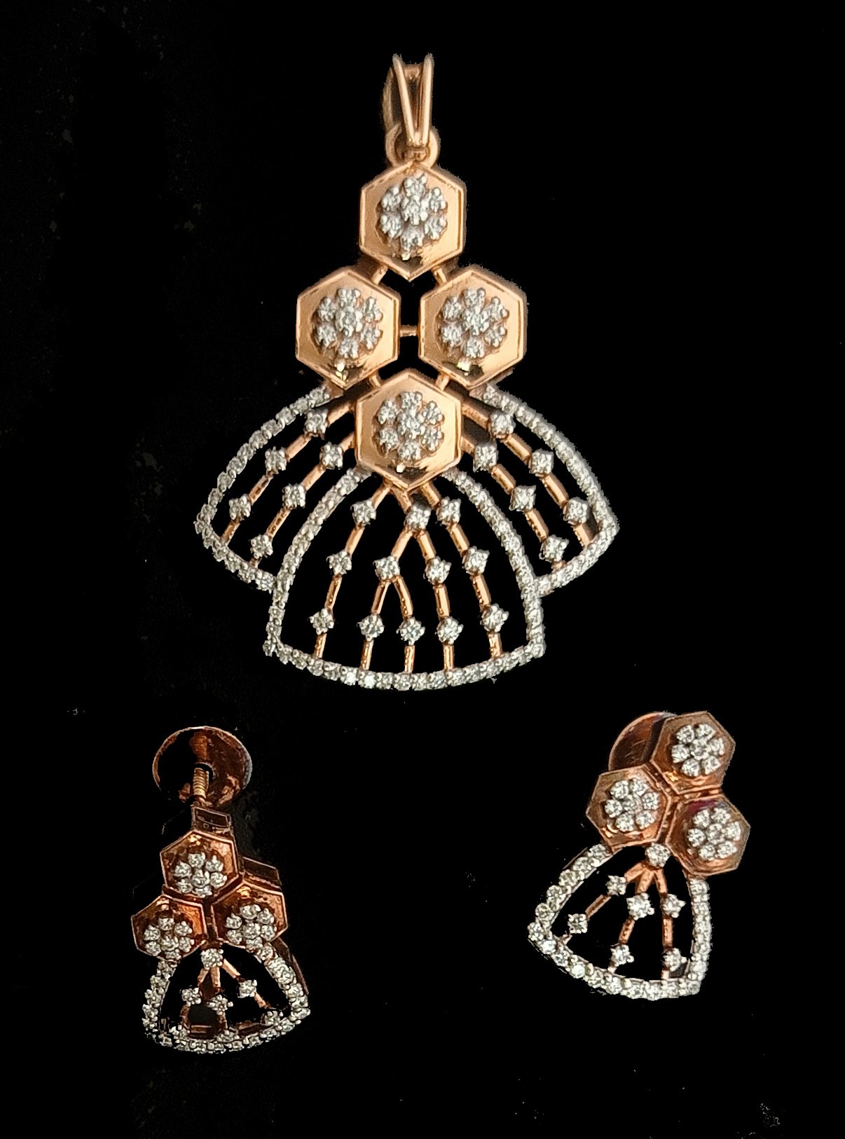 : Article Description :One Pendent Set weighing in total 12.90 gms, studded with 218 Pcs Diamonds.![]()